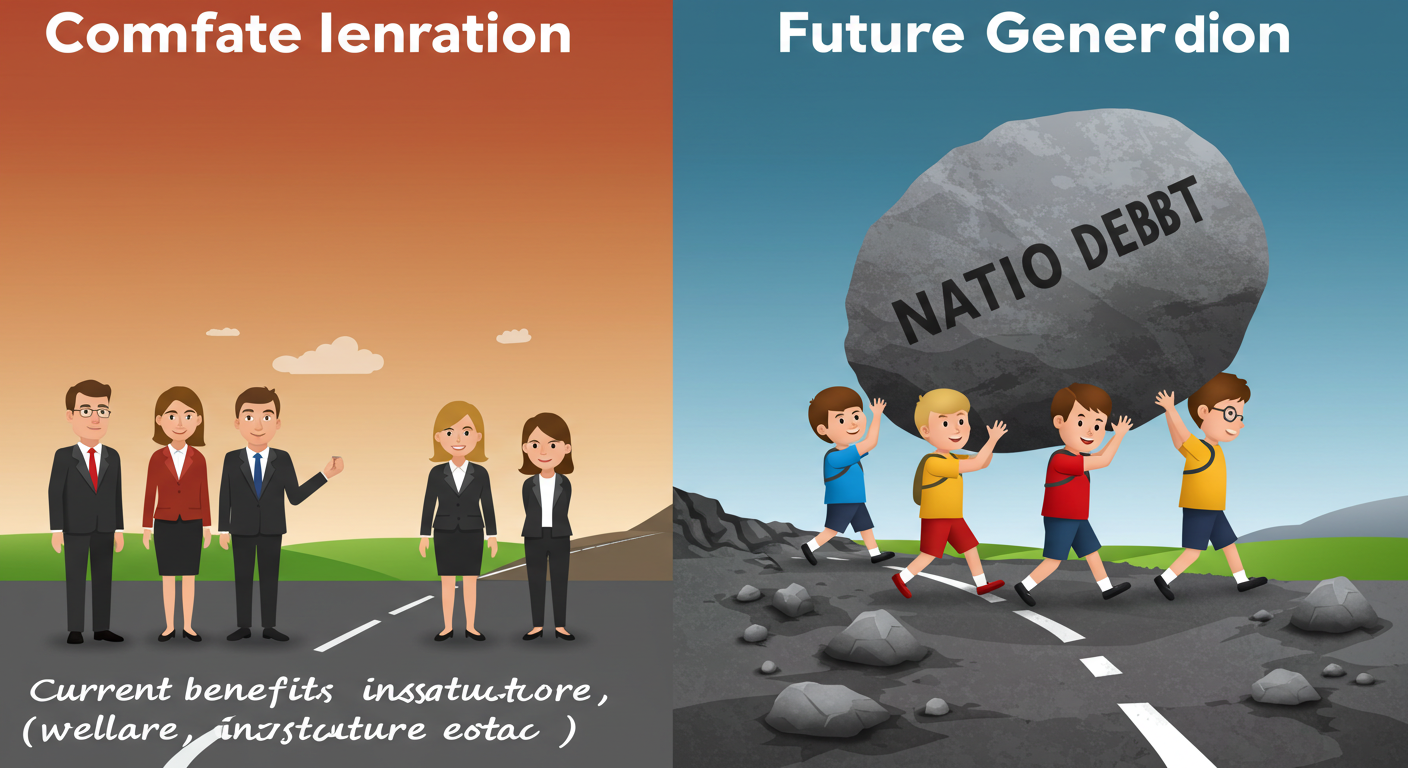 지금 정부가 낸 빚은 결국 **미래의 우리 아이들이 갚아야 할 몫**입니다. 빚을 갚기 위해 미래 정부는 세금을 더 걷거나, 복지 혜택을 줄일 수밖에 없습니다. 이는 곧 미래세대의 어깨를 무겁게 짓누르는 '세금 폭탄'으로 이어질 수 있습니다.